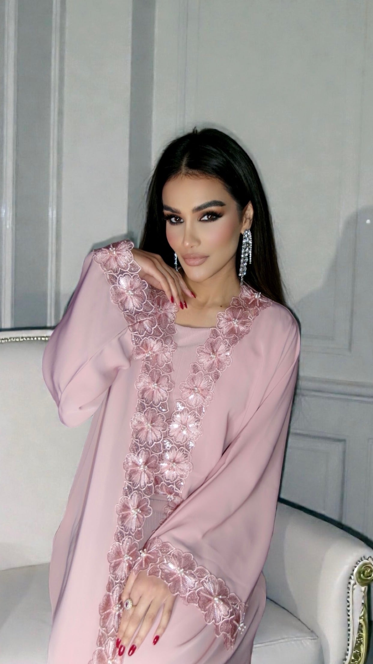 Sophisticated and luxurious, the Rose Pétale abaya from our Enchanted Rose collection is a standout piece. Featuring delicate rose lace and shimmering hand embroidery, this abaya is accompanied by a matching hijab for a complete look. In a beautiful pink rose petal colour, this abaya is perfect for any elegant occasion.